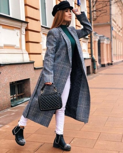 Дополнять среднее пальто в клетку можно самыми разнообразными фасонами одежды.
