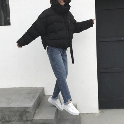 Пуховая одежда, в которой барышня как будто утопает, находится на гребне волны. Парадоксально, но при этом дама не выглядит несуразно, невыразимую прелесть ей придают обязательные детали – узенькие джинсы, брюки, обувь.