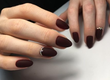 Еще один классический цвет, великолепно смотрящийся на коротких ногтях - бордовый. Попробуйте благородный бургундский или драматический оттенок черной вишни. Такие лаки подходят и для дневного времени, и для вечера. Нанося их на ногти, выравнивайте и сужайте пластину, оставляя по краям узкие незакрашенные полоски.