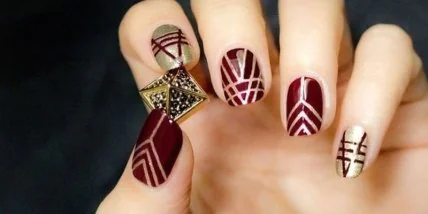 Маникюр в стиле ар деко – что может быть изысканнее? Лучший выбор для гламурной вечеринки в честь фильма "Великий Гэтсби". К тому же бордовый стал одним из трендов 2019 года, цвет старого золота вообще никогда не теряет актуальности, а объединенные вместе – они производят эффект "вау!". Главное помнить, что такой маникюр способен затмить платье, и постараться сохранить паритет между ними. Зато к соседству кольца с рубином маникюр ар деко отнесется вполне благосклонно.