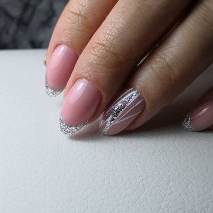 Во французском маникюре глиттер используется для декора края ногтевой пластины. Серебряный глиттер отлично смотрится со светлыми гель-лаками: белым, бежевым, голубым, серым.