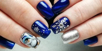 В процессе создания маникюра со снежинками важно придерживаться одной тематики. То есть в данном случае рисунок можно смело сочетать с изображением пингвинов, оленей, медведей и птиц.