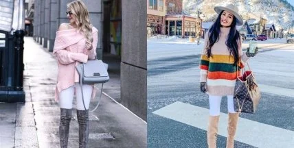 Белые, кремовые и песочные наряды роскошно смотрятся зимой на фоне снега, однако они могут казаться слишком… холодными, что ли. Для создания теплого и солнечного настроения, купите или свяжите свитер с яркими вставками. Стилисты утверждают, что в этом сезоне актуальнее горизонтальные полоски, а не вертикальные. Вдохновитесь таким ансамблем.