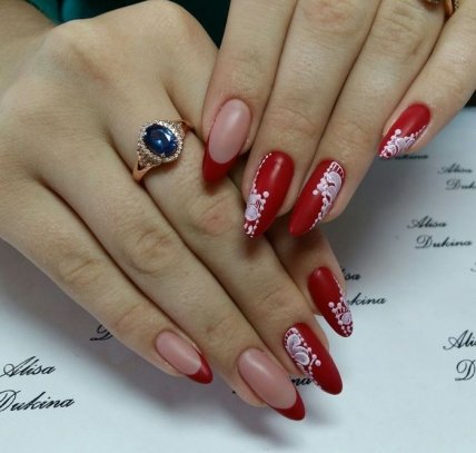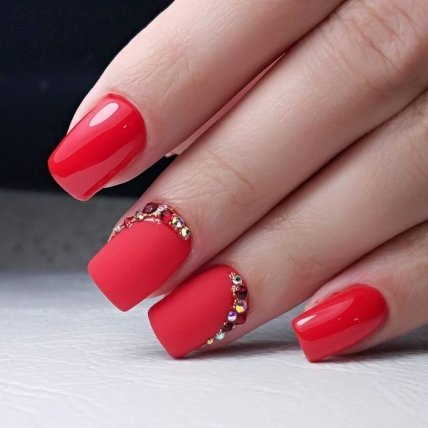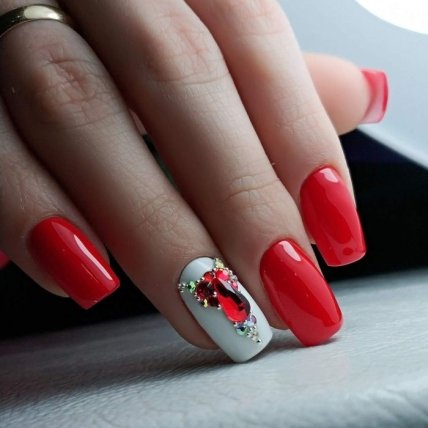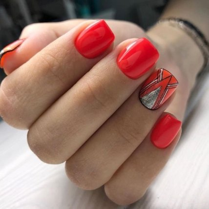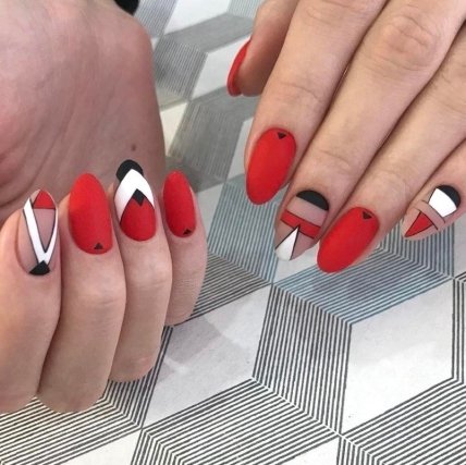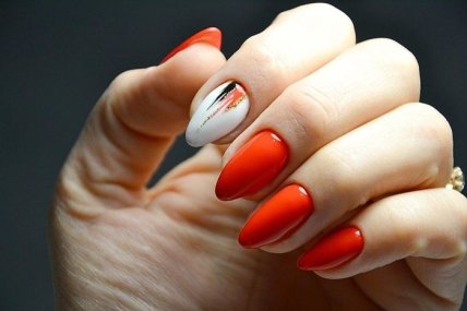 Яркий красный оттенок отлично смотрится и в одиночку, но многие мастера маникюра предпочитают данный цвет разбавлять черным и белым лаковым покрытием.