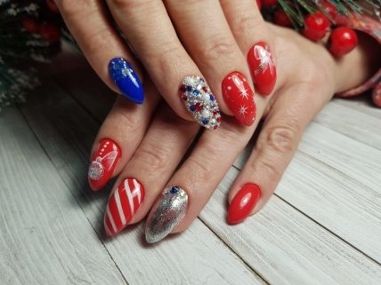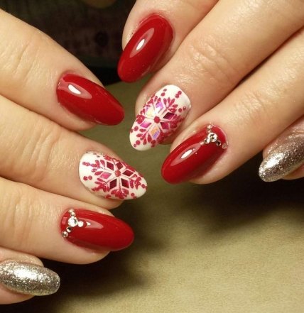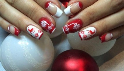 Для новогоднего маникюра стоит отдать должное предпочтение красно-синему маникюру. Красный оттенок выступает в качестве орнамента. Что касается белого цвета, то он отлично гармонирует с насыщенными тонами.