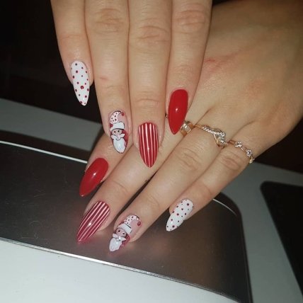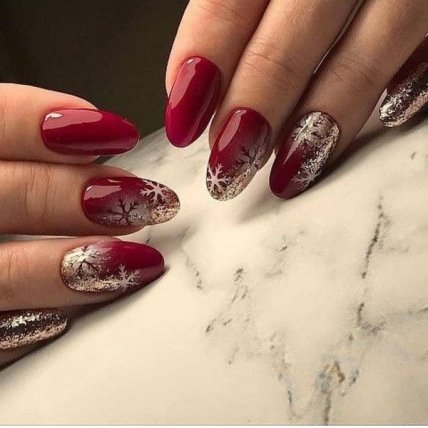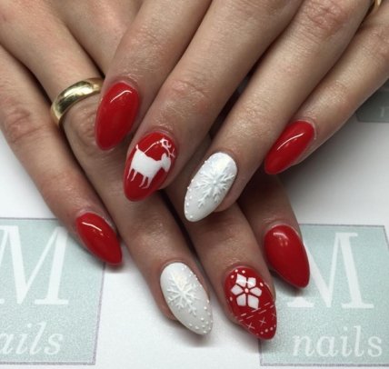 Но стоит попробовать выполнить несколько замысловатых видов декора. К примеру, красный маникюр можно дополнить росписями в виде оленей, свитера и, конечно же, снежинок.