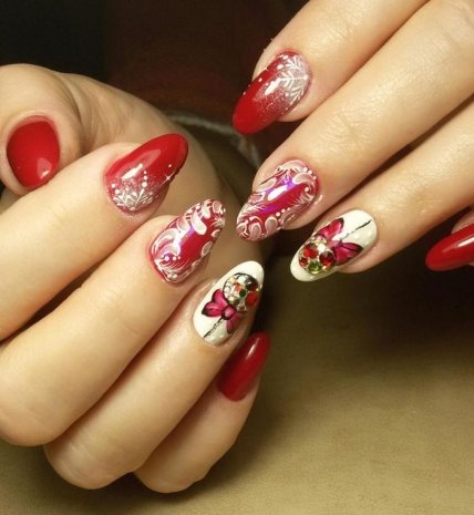 К примеру, все ногтевые пластины можно закрасить красным лаком, а безымянный пальчик стоит окрасить в белый тон, на котором изобразить тот самый бант. Его можно выполнить тоже в красном или золотом цвете.