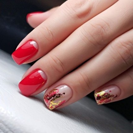 Для выполнения красного маникюра с золотом многие мастера предпочитают использовать специальные кусочки фольги или жидкий металл. Данный нейл-арт способен привлечь внимание общества.