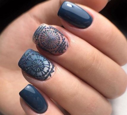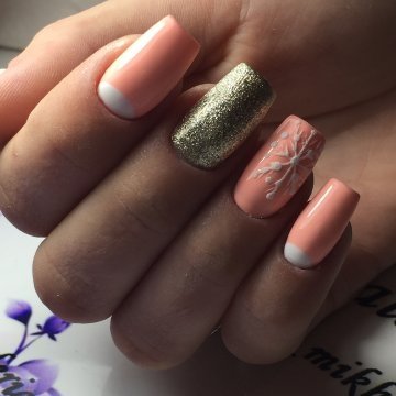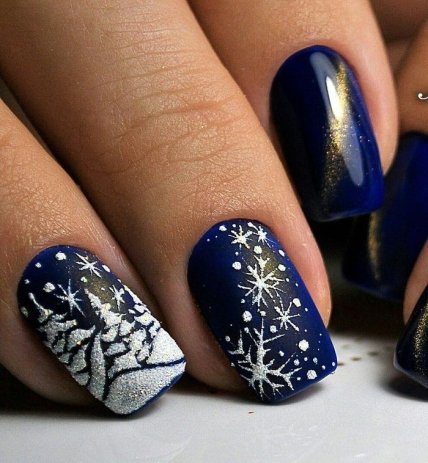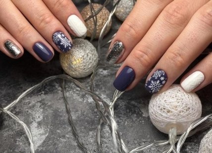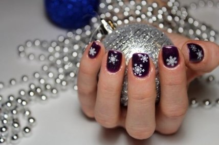 Глиттерный- удобно маникюр со снежинками наносить глиттерными лаками или при помощи мелких блесток.
