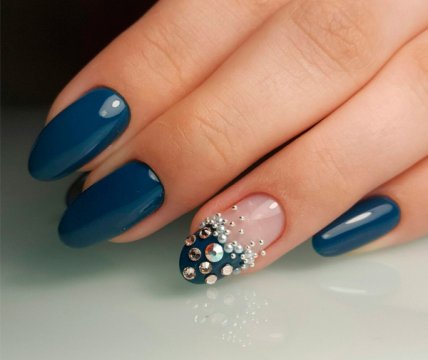 Маникюр французский (френч) или его разновидности, например, рисунок или разные цвета на ногте. Сюда же можно включить и лунный маникюр, в котором основание, а не край ногтя выделен.