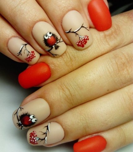 Забавные птички (пухленькие снегири и сонные совы) на ногтях выглядят очень привлекательно и мило в осенне-зимнем дизайне маникюра 2019-2020.