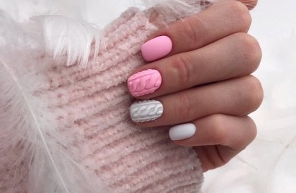 Подобный маникюр осень-зима великолепно смотрится в нежных оттенках розового, сиреневого, серого, зеленого и синего. Для большего эффекта вязаный маникюр делают матовым и покрывают акриловой пудрой.