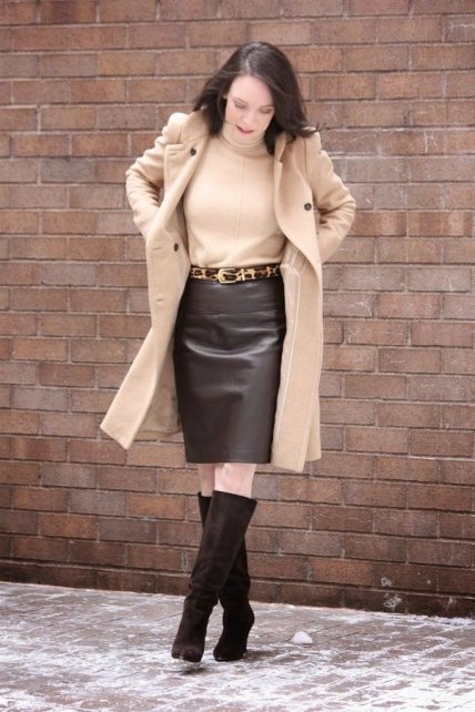 Ультрамодное сочетание можно создать с помощью ансамбля из песочных и коричневых цветов. Чудная кожаная юбка кофейного оттенка стильно смотрится со светлым свитером. Хотите ярких ноток? Выбирайте дизайнерский ремень с животным принтом.