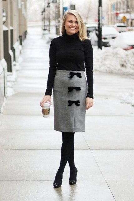 Очень строго смотрятся все детали ансамбля: гольф, чулки и обувь в черном цвете плюс сдержанная серая юбка. Удивите окружающих креативностью и игривостью, украсив юбка бантиками, ведь банты сейчас в моде. Их можно увидеть в трендовых прическах, а так же в моделях одежды именитых дизайнеров. Например, банты присутствуют в коллекции от Valentino.