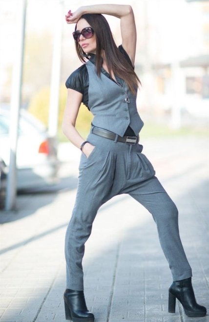Брюки фасона галифе (с расширением в верхней части и сужеными штанинами) гарантировано привлекут к вам внимание. Создайте однотонный ансамбль, надев жилетку и блузку того же оттенка или схожего с цветом брюк.