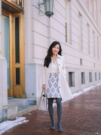 Бесспорно, классическим вариантом для делового образа остаются наряды с черными чулками. Но если вы работаете в сфере моды или в вашем офисе дозволяется креативный облик, то выбирайте колготки необычного цвета. Если сочетать колготки с цветом обуви, то получится зрительно удлинить ноги. Еще одно нестандартное решение – юбка с необычным принтом. Нежная блуза с запахом – мастхэв для любительниц романтичных образов.