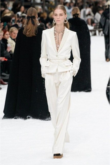 Белые наряды довольно маркие, но морозы зимы защищают их от грязи. Вы будете просто роскошно смотреться в белом костюме из струящейся ткани. Если вам не нравятся снежные оттенки белого, выбирайте другие модные его цвета: слоновой кости, беж и так далее. Изюминкой наряда станут украшения модных трендов: с золотыми цепочками, со стразами или жемчугом.