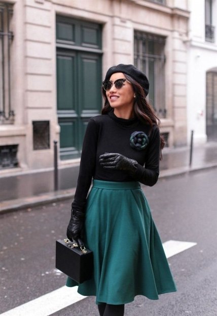 Строгий черный гольф будет выглядеть женственно благодаря стильному аксессуару. Это может быть, например, цветок, повторяющий цвета гольфа и юбки. Самыми популярными фасонами юбок сейчас остаются фасоны миди или с длиной до колена. Беспроигрышный вариант – это юбка фасона "полусолнце".