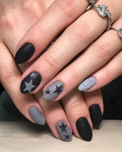 Маникюр со звездами смотрится очень нежно и мило. Даже если эти звёздочки будут на черной основе лака.