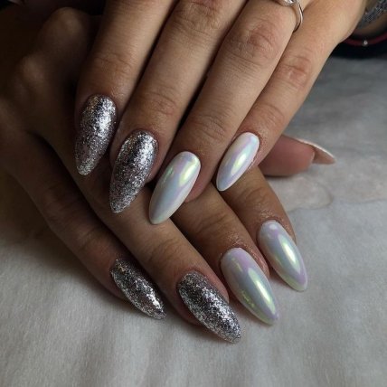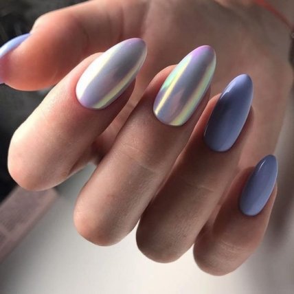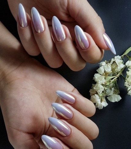 Жемчужная втирка отлично будет смотреться на разной длине ногтя и такой вариант будет особенно модным в 2020 году.
