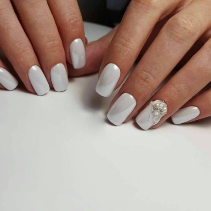 Белая втирка самая универсальная, ведь ее цвет способен подойди как к яркой, так и однотонной одежде любого цвета. Она делает маникюр эстетичным, а ручки выглядят более ухоженно.