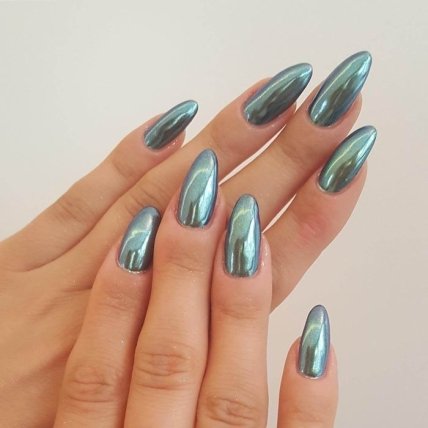 На длинных ногтях втирка раскрывает свой цвет на полную. Здесь особенно хорошо заметны переливы цвета, насыщенность блеска, а также глубина оттенков.