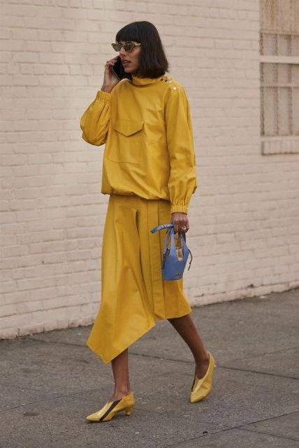 Если вы не очень любите эксперименты и предпочитаете избегать таких ярких цветов, как желтый, то обратите внимание на образ, что на фото. Да, желтый тоже может выглядеть элегантно! Но нужно выбирать классические вещи: юбку миди, блузку и элегантную сумку. Обувь должна быть в гармонии с основным комплектом.