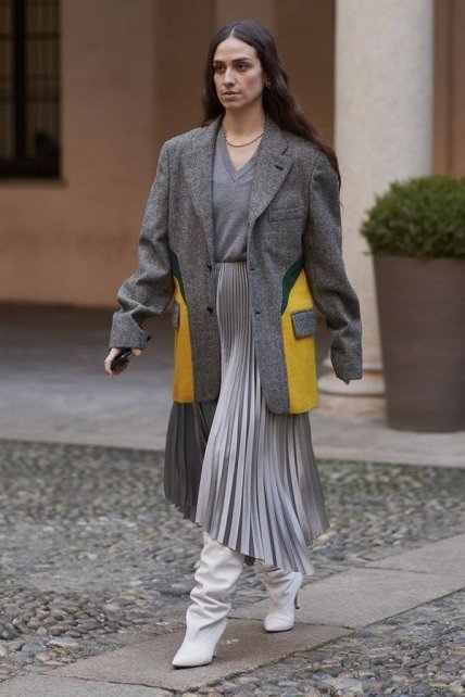 Серый цвет считается базовым и легким в сочетаниях. Самое главное, что серый цвет и сам по себе смотрится очень стильно и целостно. В этом году многие мировые модницы стали фанатками серого цвета. Чтобы добавить яркую нотку в наряд, выберите яркие ботинки на каблуке.