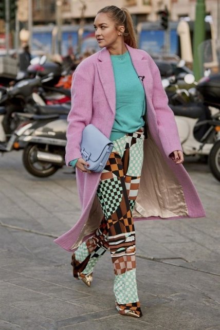 Пастельные цвета тоже замечательно сочетаются между собой. Если у вас есть пиджак такого цвета, комбинируйте его со штанами пастельного тона. Но не забудьте про элегантную сумочку бежевого или коричневого цвета.