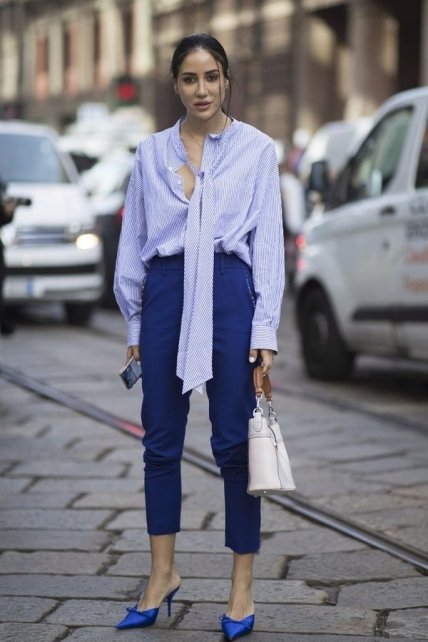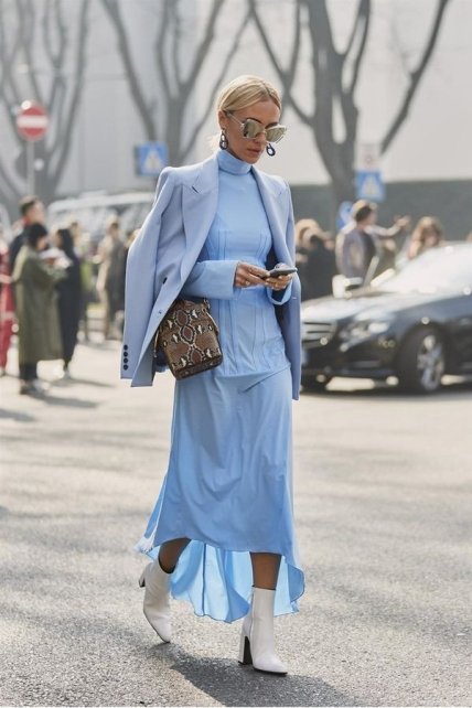 Когда вещи в одном цвете, то разница тонов не так уж и важна. Мы уже показали образ с ярким оттенком голубого цвета, а сейчас хотим представить шикарный образ в пастельных оттенках. Вдохновляйтесь этим нарядом! Обязательно приобретите оригинальные ботинки на каблуке.