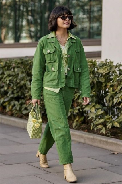 Монохромные образы – тренд сезона. Мировые модницы предпочитают такие яркие и смелые цвета, как зеленый. В чем секрет? Сочетайте зеленые вещи уличного стиля: джинсы, джинсовые куртки, рубашки… А вот обувь должна быть простой и элегантной.