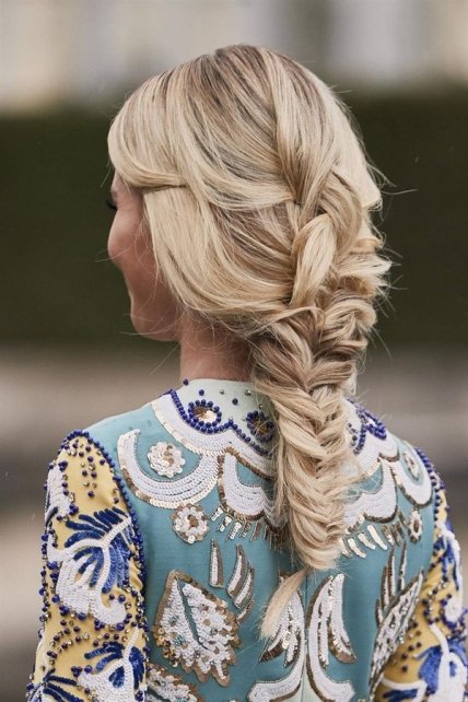 Что может быть более элегантным, красивым и женственным? Это новая версия французской косички: небрежный стиль, переплет тонких прядей на середине длины и рыбья косичка, которая красиво спадает на спину. Небрежный эффект придает образу романтичности и непринужденности.