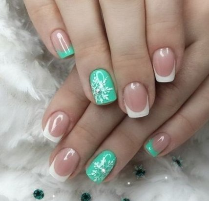 Интересный и необычный маникюр подойдет для стильных девушек, которые во всем предпочитают эксклюзивность. Для него потребуются белый и зеленый лаки, а также бесцветная основа. Рисунок снежинки, дополненный стразами, придаст дизайну законченность. Такой маникюр одинаково годится для новогоднего праздника и для ранней весны. Может применяться для ногтей средней длины.