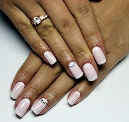 Нежно-розовый френч с лунными полосками и стразами выглядит очень стильно. Такой светло-молочный дизайн подходит юным невестам, модным дамам любого возраста. Покрытие шеллак будет держаться более 3 недель, радуя своей гладкостью и блеском. Эффектный ободок из стразов на безымянных пальцах акцентирует внимание на узоре, оттеняет лунный дизайн. Можно дополнить образ колечком, браслетом из блестящих камней.