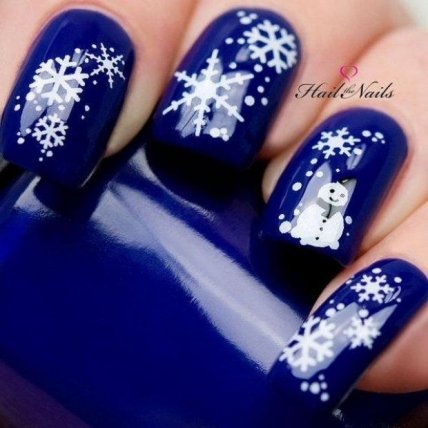 Синий зимний вечер, тихий снег, канун Рождества… Чтобы любоваться этой картиной как только захочется, всего-то и нужно три лака – белого, голубого и глубокого синего цвета. Нет ничего проще, чем изобразить на ногтях снеговика, а более тонкие детали в виде снежинок можно выполнить при помощи пластины для стемпинга или использовать слайдер-дизайны.