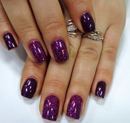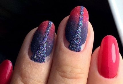 Этот дизайн ногтей великолепно подойдет для корпоративной вечеринки, новогоднего праздника или другого важного мероприятия. Плавный матовый переход с темно-фиолетового к розовому смотрится очень феерично и необыкновенно, а блестки на таком фоне идеально подходят под выбранное сочетание цветов. Этот маникюр не обязывает к определенному цвету наряда, но великолепно будет выглядеть темное платье в пол.