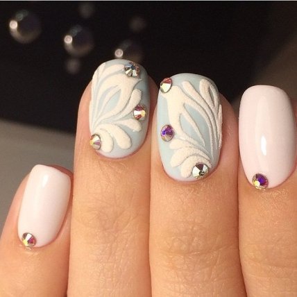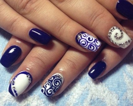 Изысканный вариант ногтевого дизайна в сине-белых тонах чем-то напомнит роспись "под гжель". Большое количество стразов придаст вашему облику необходимый шарм. Для такого маникюра можно использовать гель-лак. Спиральные узоры потребуют некоторых навыков в искусстве несения рисунков на ногти. Маникюр хорошо смотрится на ногтях средней длины, но к нему необходимо грамотно подбирать украшения.