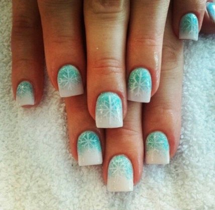 Мягкий и нежный вариант оформления для Ваших ноготков. Интересное решение градиентного перехода цветов из молочно-белого в светлый бирюзовый оттенок дарит ощущение загадки и недосказанности. А лак с блестками напоминает снег, искрящийся под лучами утреннего зимнего солнца. Каждый ноготь украшен тонкой ажурной снежинкой, что придаст изюминку любой девушке. Идеальный маникюр для зимних вечеринок с горячим глинтвейном. Вы точно будете в центре внимания!