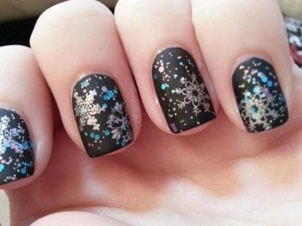 Цвета, которые считаются традиционно рождественскими: красный, золотой, белый и зелёный. Но стоит ли ограничивать себя, сочиняя дизайн для праздничного маникюра? Вот вполне нетривиальный вариант: голубой и сиреневый глиттер, серебряные снежинки на чёрном матовом фоне. Будто снег выпал именно в новогоднюю ночь… Снежинки можно изобразить при помощи плитки для стемпинга или упростить себе задачу, наклеив стикеры.