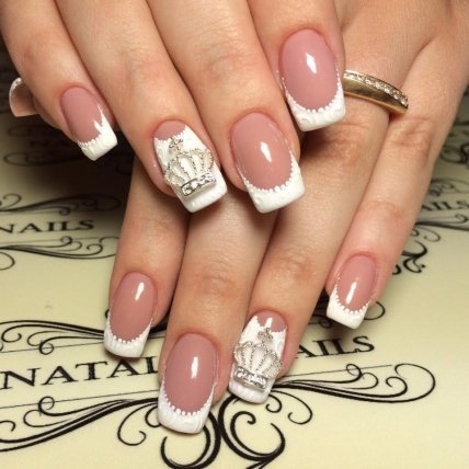 Красивый и модный френч-дизайн с основанием светло-бежевого цвета и белыми кончиками ногтей. Акцент сделан на безымянном пальце, который выполнен в стиле лунного маникюра белого цвета с ажурными рельефными узорами и роскошным украшением в виде короны со стразами. На каждом кончике ногтя нанесен такой же элегантный объемный узор. Вдоль изгиба линии ногтя проходят крошечные крапинки, придающие такому маникюру вид тонкого легкого кружева.