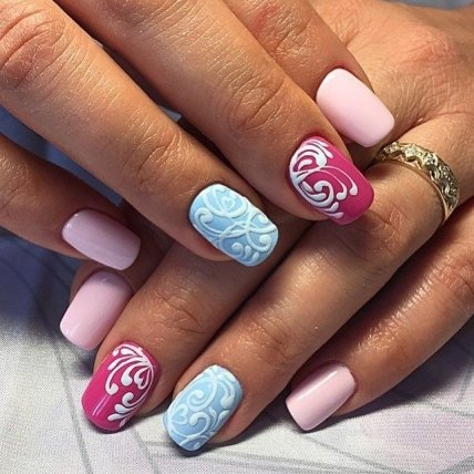 Спокойный и элегантный вариант маникюра одинаково хорошо будет смотреться и в будние дни, и на праздничном вечере. Дизайн выдержан в спокойных однотонных цветах. Бледно-розовый и голубой создают ровное настроение, а неожиданный в этом случае малиновый оттенок придает праздничность всему маникюру. Законченность дизайна достигается рисунком, который имитирует морозные узоры. Маникюр подходит для зимы.