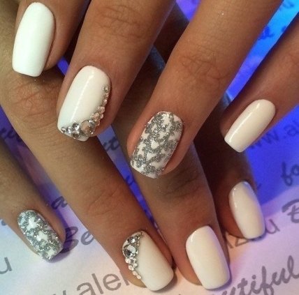 Этот новогодний маникюр выполнен в холодных серебристых тонах, украшен рисунками из стразов. Молочный глянец покрытия оттеняет металлический блеск серебра, переливается перламутровыми оттенками. Разнообразие светящихся камушков делает такой дизайн искрящимся и праздничным. Изящный рисунок из мерцающих блесток дополнит образ Снежной королевы или Снегурочки, добавит наряду очарования.