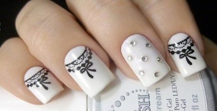 Лаконичный и интригующий вариант оформления ногтей. Глубокий белый цвет основного лака с тонким рисунком, выполненным черными штрихами отлично дополняют друг друга. А один палец, украшенный блестящими стразами, завершают образ женщины загадки. Рисунок напоминает ажурные подвязки для чулок, что дает безграничные просторы для мужских фантазий. Поверьте, с подобным маникюром Вы не останетесь без мужской компании!