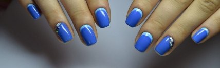 Весьма легкий и воздушный маникюр, который достойно украсит Ваши ноготки. Насыщенный голубой цвет основного лака в сочетании с тонкой полоской бледно-голубого вдоль кутикулы дарят ощущение свободы и независимости. Небо, простор и бесконечность – вот что приходит на ум, глядя на такой рисунок. Особым элементом, привносящим эксклюзивность, будут играющие светом россыпи стразов на безымянных пальцах. Такой вариант оформления будет уместен везде и всегда!