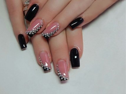 Вечерний маникюр гель-лаком со стразами выглядит сексуально и притягательно. Шикарный блеск черного покрытия добавляет ему сексуальности, соблазнительный узор из камушков очаровывает с первого взгляда. Полупрозрачная основа с оригинальным рисунком из блесток в виде полумесяца идеально подходит к серебряным украшениям, коктейльному кружевному платью. Такой дизайн всегда будет на пике популярности.