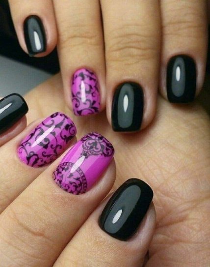 Для ноготков удлиненной формы такой маникюр окажется идеальным. Он выполнен в готическом стиле, так что утонченные натуры вряд ли пройдут мимо такого варианта. Преимущество отдается черному лаку (можно использовать гель). Романтичную нотку такому маникюру придаст использование розового лака. Рисунок на ногтях можно сделать вручную, однако столь же изысканно будут смотреться и наклейки. Необходимо уделить внимание внешнему покрытию, чтобы ваши ногти сверкали.