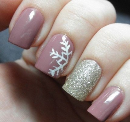 Этот зимний маникюр выполнен в холодных тонах, разбавлен блестками и снежным узором. Насыщенный цвет шоколадно-сливового покрытия добавляет ему торжественности, настраивает на добродушный лад. Серебристые блестящие частички полностью покрывают ногти на безымянных пальцах. Яркий глянец основы разбавлен белоснежной снежинкой, эффектным мерцанием серебра.