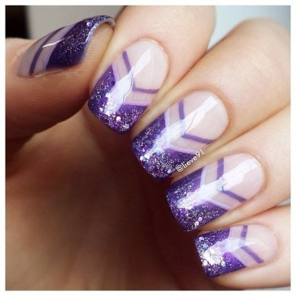 Восхитительный дизайн ногтей, который позволит вам выглядеть неотразимо на любом событии или мероприятии. Поверх светло-бежевого фона нанесен рисунок из двух полос сиреневого и молочно-сиреневого цветов. Кончики ногтей покрыты ярким фиолетовым лаком с крупными блестками. С таким маникюром ваши ручки будут выглядеть шикарно при любых обстоятельствах.