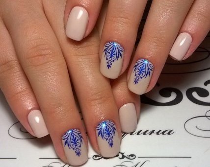 Очень чувствительный и нежный дизайн маникюра. Тут отлично сочетаются мягкий, молочно-белый лак основы с тонким и изысканным рисунком, выполненным тонкими штрихами насыщенного синего цвета. Сам рисунок напоминает узоры, которые мороз рисует на стекле зимними вечерами, или народные орнаменты. Подобное украшение пальчиков станет отличным дополнением любого новогоднего наряда, и поможет Вам выглядеть совершенно неотразимо!