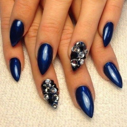 Роскошный и красивый дизайн маникюра, который точно обратит на себя внимание. Главным элементом станет необычная форма ногтя с заостренным кончиком. А синий лак с металлическим блеском придаст некий космический холодный шарм. Декоративное украшение ноготка безымянного пальца россыпью блестящих стразов дополнит Ваш образ неприступной женщины, эдакой Снежной Королевы. Отлично подойдет для торжественных мероприятий.